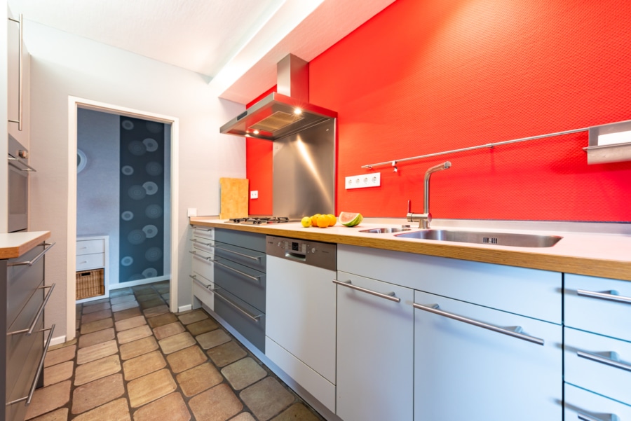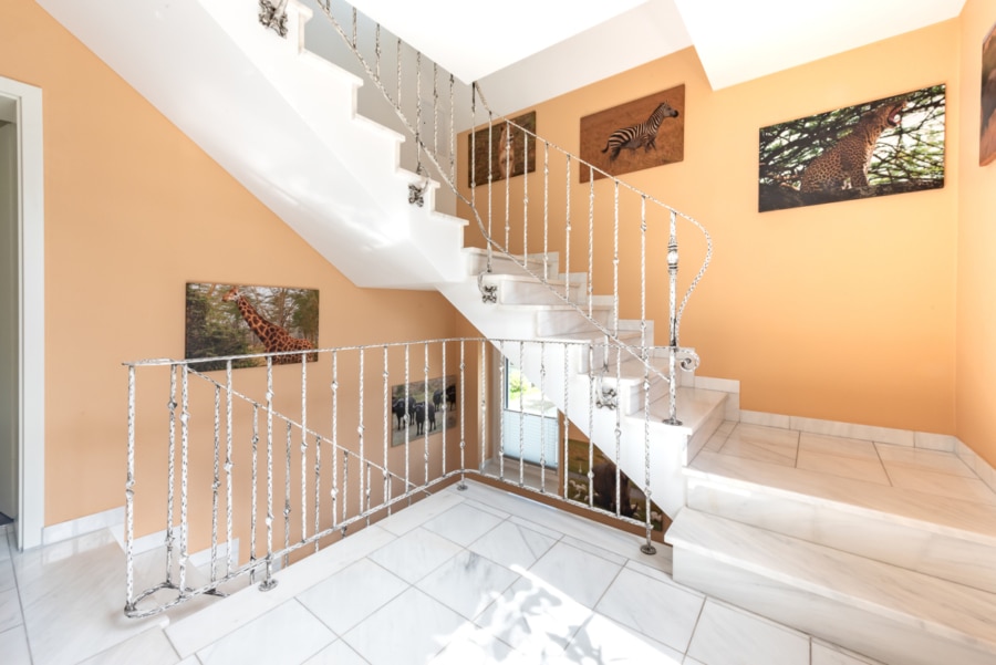 Bereits der Eingangsbereich vermittelt mit seinem edlen weißen Marmorboden einen repräsentativen ersten Eindruck. Von hier aus gelangen Sie in die exklusive Bulthaup-Designküche, die mit klarer Formensprache, hochwertigen Geräten und großzügigen Arbeitsflächen überzeugt. Der angrenzende Essbereich ist offen gestaltet und bietet viel Raum für gemeinsame Stunden. Küche und Wohnbereich öffnen sich harmonisch zur aufwendig angelegten Gartenlandschaft, die mit mehreren Bankirai-Terrassen und integrierten Teichanlagen ein besonderes Highlight darstellt. Die großzügige Terrasse mit Markise sowie eine überdachte Sitzfläche zwischen zwei Wasserflächen schaffen ein Ambiente mit hohem Erholungswert.