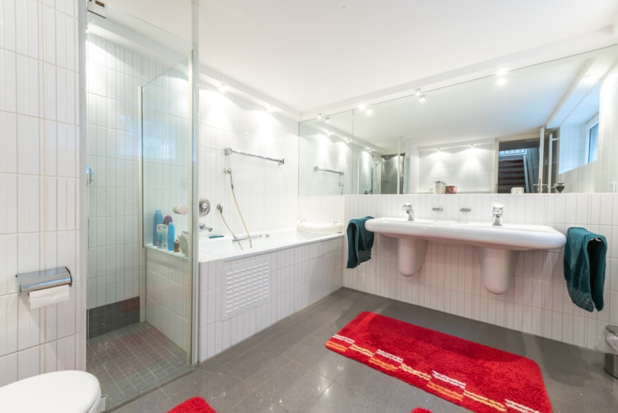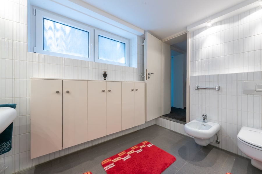 Im Untergeschoss befindet sich der private Schlafbereich der ersten Einheit. Neben einem großzügigen Schlafzimmer steht ein separater Ankleideraum zur Verfügung. Das Badezimmer ist hochwertig ausgestattet und verfügt über eine Whirlpoolbadewanne, eine ebenerdige Dusche, einen Doppelwaschtisch sowie ein Bidet. Eine Sauna sowie ein zusätzlicher Raum bieten weitere Nutzungsmöglichkeiten. Die im Jahr 2016 erneuerte Gasheizung befindet sich in einem separaten Technikraum. Das elegante Marmortreppenhaus verbindet alle Ebenen miteinander.