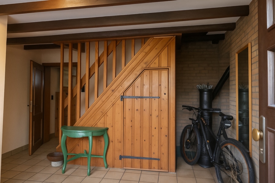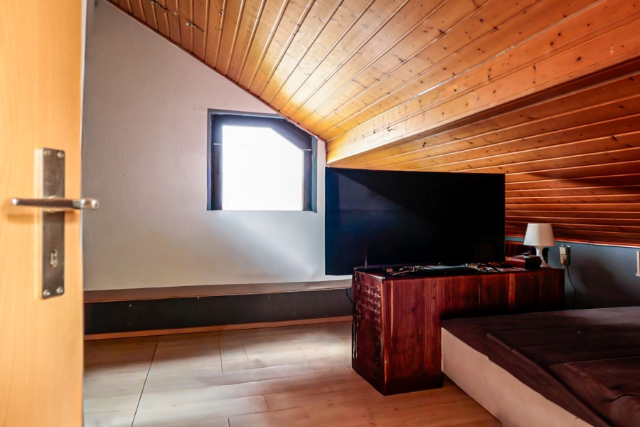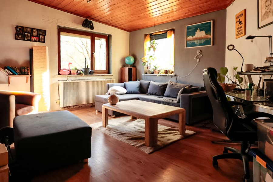 Die Einliegerwohnung verfügt über einen separaten Eingang und erstreckt sich über zwei Etagen. Im Erdgeschoss befinden sich der Eingangsbereich mit praktischer Küchennische, ein Badezimmer mit Dusche sowie ein helles Wohnzimmer. Das Dachgeschoss bietet ein gemütliches Schlafzimmer unter der Dachschräge. Diese Wohneinheit eignet sich ideal zur Vermietung, als Gästebereich oder für Familienmitglieder, die etwas Privatsphäre genießen möchten.