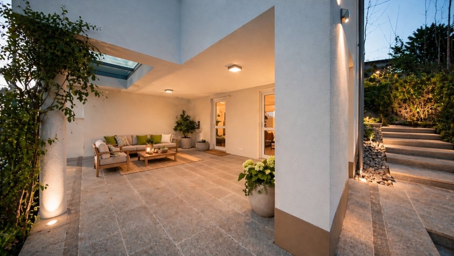 Im Inneren überzeugt das Haus mit einem rund 30 m² großen Wohnbereich, der durch den gemütlichen Kaminofen zum Mittelpunkt des täglichen Lebens wird – mit direktem Zugang zur Dachterrasse.
