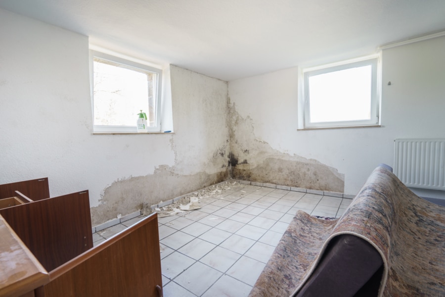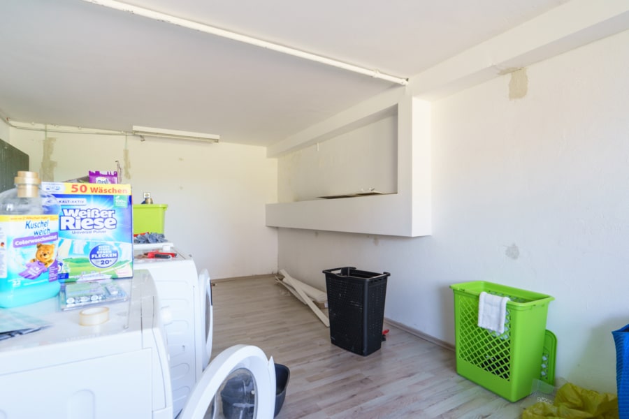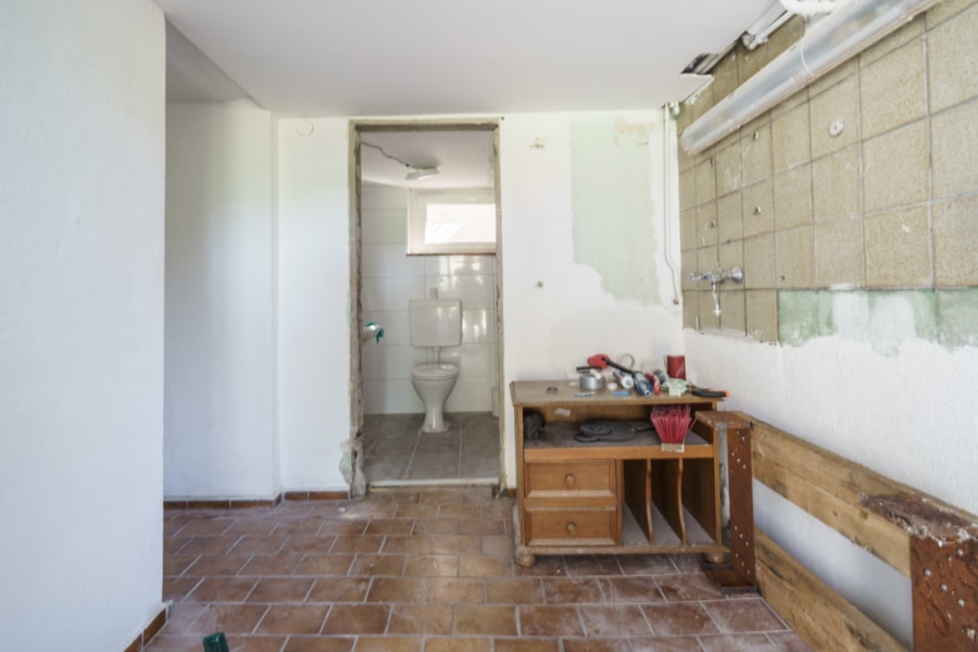 Das noch nicht vollständig ausgebaute Wohnung im Erdgeschoss zeigt deutlich das Potenzial für eine dritte Wohneinheit. Die Grundstruktur ist bereits geschaffen, Trennwände und Versorgungsleitungen sind teilweise vorhanden. Der Rohbau-Zustand erlaubt es zukünftigen Eigentümern, die Gestaltung ganz nach eigenen Wünschen zu vollenden.