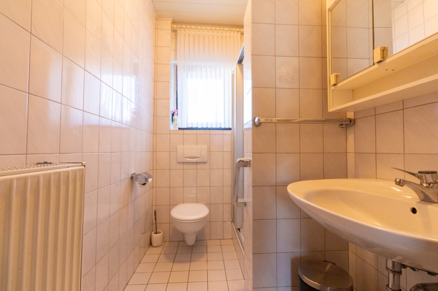 - **Badezimmer:** Genießen Sie die Vorzüge eines lichtdurchfluteten Badezimmers, das mit einem großen Fenster ausgestattet ist. Die moderne Dusche bietet Ihnen ein erfrischendes Duscherlebnis, während hochwertig verbaute Armaturen für ein luxuriöses Ambiente sorgen.