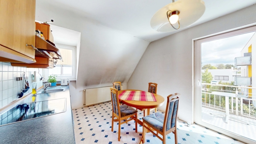 eine helle Wohnküche mit Zugang zum sonnigen Westbalkon,