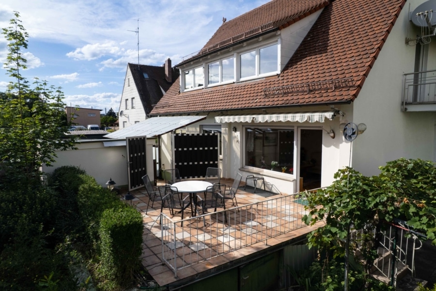 Die Terrasse mit Südwest-Ausrichtung lädt zum Verweilen ein und öffnet sich zum gepflegten, grünen Garten – ein echtes Highlight für Sonnenliebhaber, Familienfeste oder ruhige Abende im Freien.