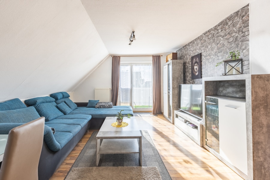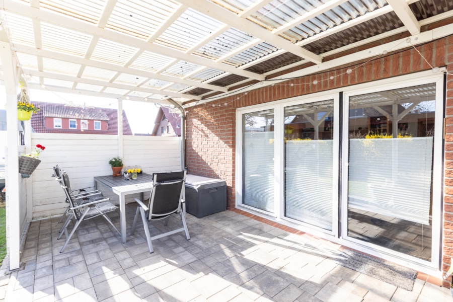 Das großzügige Wohnzimmer mit etwa 24 m² bietet einen direkten Zugang auf die überdachte Südterrasse und in den Garten – ein schöner Ort zum Entspannen.