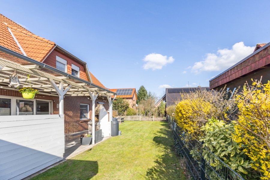 Der Außenbereich bietet einen gepflegten Garten mit Rasenfläche.