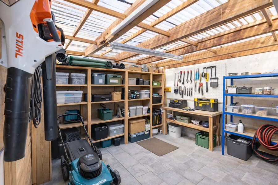 Ein Geräteschuppen neben dem Carport bietet zusätzliche Abstellfläche.