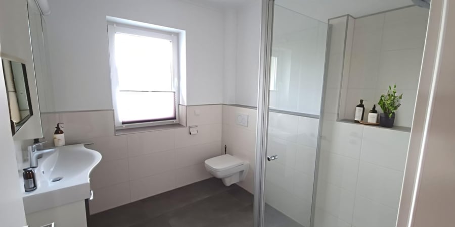 Das Tageslichtbad ist mit einer ebenerdigen Dusche, eleganter Ausstattung und angenehmer Fußbodenheizung ausgestattet. Zusätzlich steht Ihnen ein praktischer Abstellraum mit Waschmaschinenanschluss zur Verfügung.