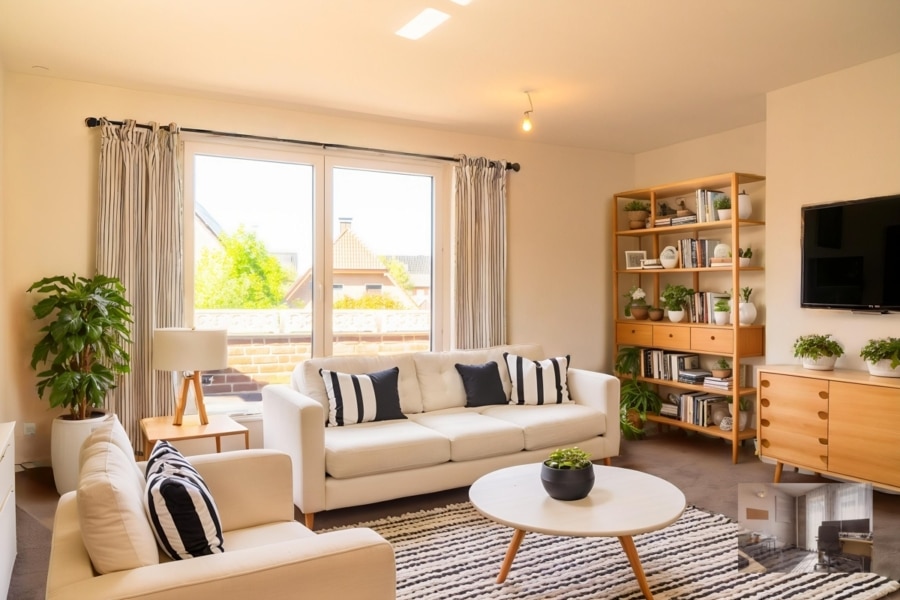 Die Wohnung wurde vollständig renoviert und bietet ein helles Wohnzimmer mit Zugang zum Balkon, zwei Schlafzimmer, ein Tageslichtbad sowie einen Abstellraum. Die Böden sind teils gefliest, teils mit Teppich belegt. Die moderne Wärmepumpe (Baujahr 2021) sorgt für energieeffiziente Beheizung.