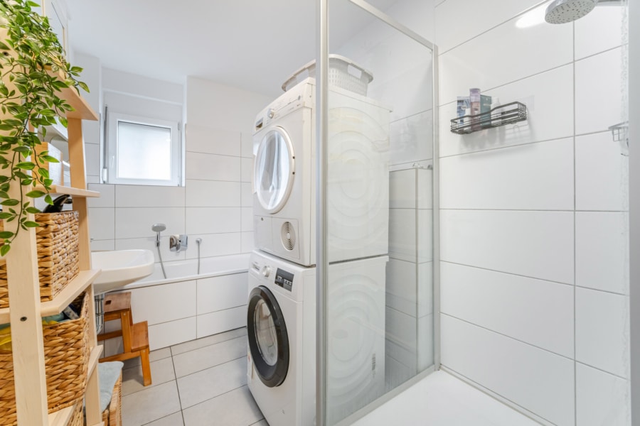 - Badezimmer: Dusche, Badewanne und Waschmaschinenanschluss