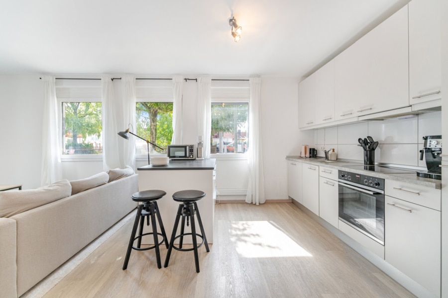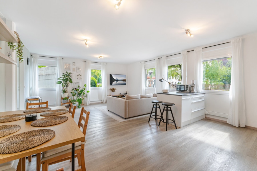 Der offene Wohn- und Essbereich mit Einbauküche bildet das Herzstück der Wohnung. Große, schallisolierte Fenster sorgen für ein angenehmes Wohngefühl, während Laminat- und Fliesenböden pflegeleichte Alltagstauglichkeit garantieren. Das Badezimmer ist mit Dusche, Badewanne und Waschmaschinenanschluss komfortabel ausgestattet.