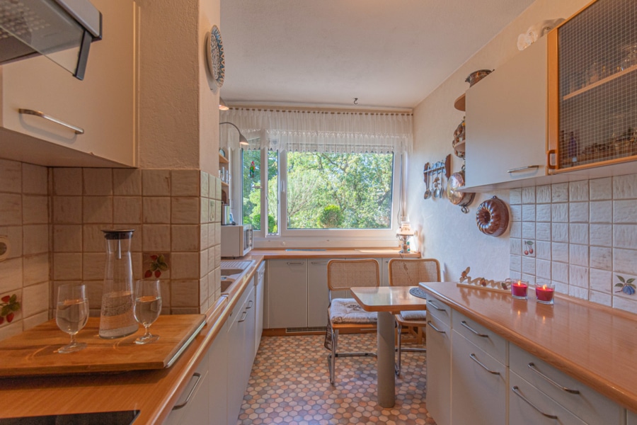 • Küche + Esstisch mit älterer Einbauküche