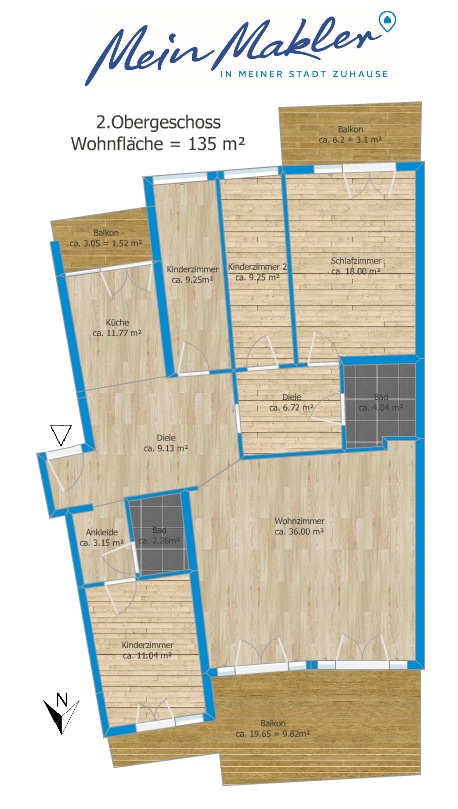 Auf einer großzügigen Wohnfläche von ca. 135 m² präsentiert sich die Immobilie lichtdurchflutet und hervorragend geschnitten. Der offen gestaltete Wohnbereich bietet viel Platz für geselliges Beisammensein und entspannte Familienabende. Große Fensterflächen in allen Räumen sorgen ganztägig für ein freundliches, helles Wohnambiente. Die drei vorhandenen Balkone erweitern den Wohnraum nach draußen und bieten – je nach Tageszeit – sonnige oder schattige Rückzugsorte.