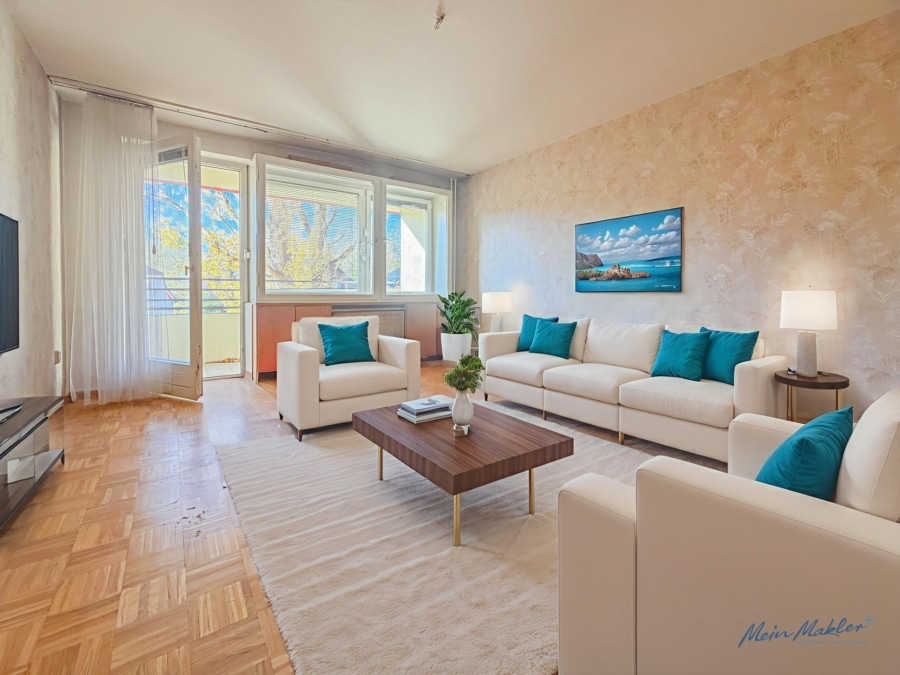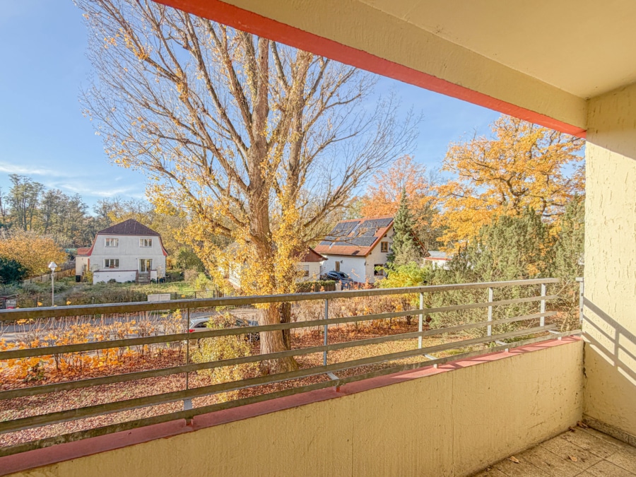 Ein Aufzug bringt Sie bequem in Ihre Etage. Vom hellen Wohnzimmer aus gelangen Sie auf den sonnigen Balkon, der einen schönen Blick ins Grüne bietet – perfekt für den ersten Kaffee am Morgen oder entspannte Stunden am Abend.
