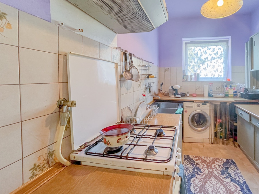 Die Wohnung präsentiert sich in einem relativ gepflegtem Zustand und verfügt über einen einladenden L-förmigen Flur, von dem aus alle Räume erreichbar sind. Zu den weiteren Merkmalen gehören ein Badezimmer mit Badewanne und Fenster, ein geräumiges Wohnzimmer, ein großes Schlafzimmer, eine separate Küche und eine Abstellkammer. Eine ältere Einbauküche ist ebenfalls vorhanden. Besonders hervorzuheben ist der komfortable Balkon, der zum grünen Hinterhof bzw. nach Nordosten ausgerichtet ist.