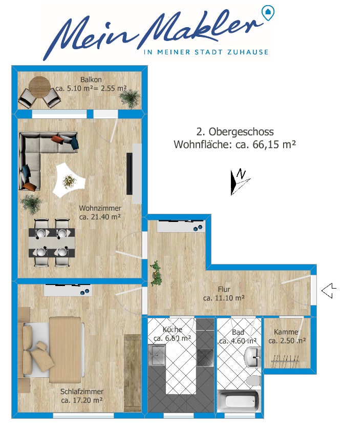 Die angebotene 2-Zimmerwohnung erstreckt sich über ca. 66 m² Wohnfläche und befindet sich im 2. Obergeschoss eines im Jahr 1966 erbauten Mehrfamilienhauses.