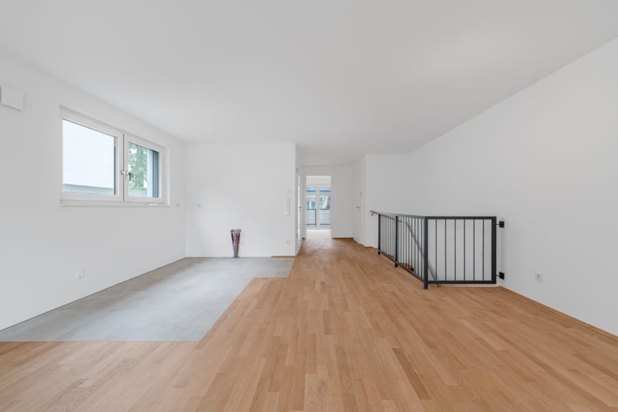 Die angrenzende offene Küche lässt sich ganz nach persönlichen Vorstellungen gestalten und wird zum kommunikativen Treffpunkt des Hauses. Ein komfortables Schlafzimmer auf dieser Ebene bietet einen ruhigen Rückzugsort, während das moderne Duschbad mit Gäste-WC den funktionalen Anspruch dieser Etage perfekt ergänzt.