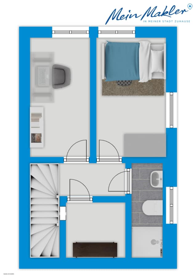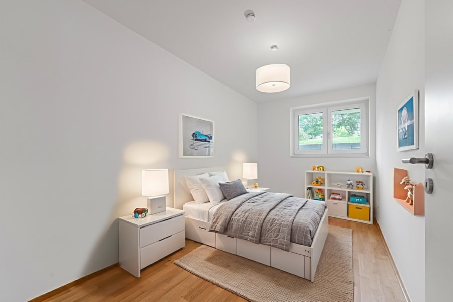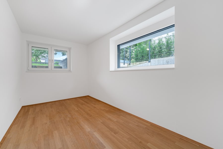 Über eine innenliegende Treppe erreichen Sie die untere Wohnebene, die mit zwei weiteren Zimmern vielseitige Nutzungsmöglichkeiten eröffnet. Ob Kinderzimmer, Homeoffice, Gästezimmer, Hobbyraum oder Fitnessbereich – hier ist Raum für Ihre persönlichen Wohnideen. Ein zusätzlicher Abstellraum sorgt für praktischen Stauraum und unterstützt eine klare, aufgeräumte Wohnstruktur.