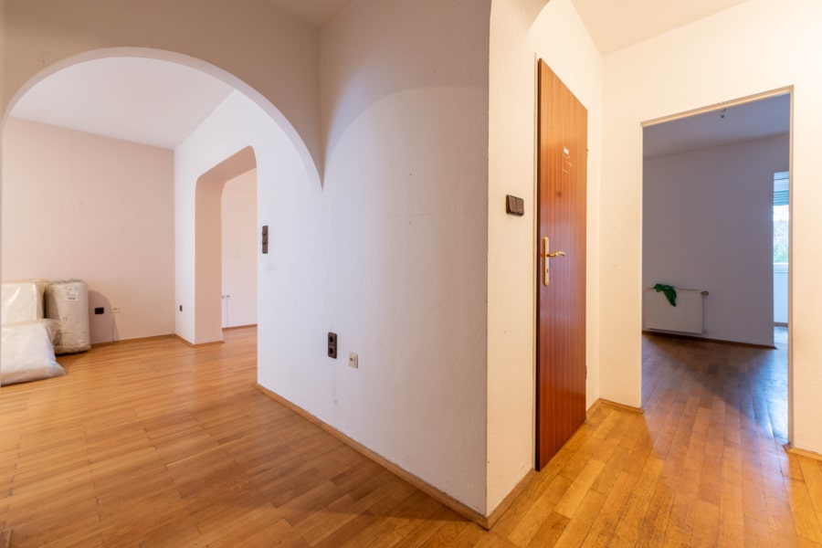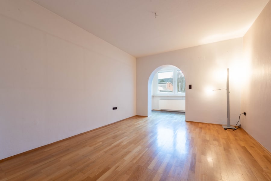Über die zentral gelegene Diele sind alle Wohn-/ Schlafräume bequem erreichbar. Der großzügige Wohnbereich bildet das Herzstück der Wohnung und besticht durch seine Offenheit sowie einen charmanten Rundbogen, der dem Raum einen besonderen Charakter verleiht. Große Fenster sorgen für eine helle und freundliche Atmosphäre.