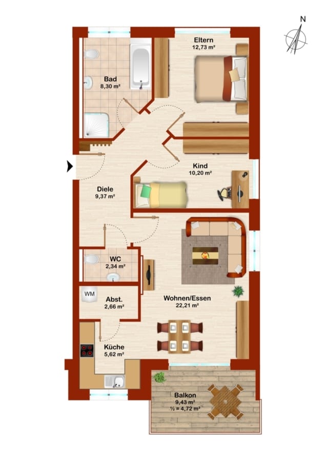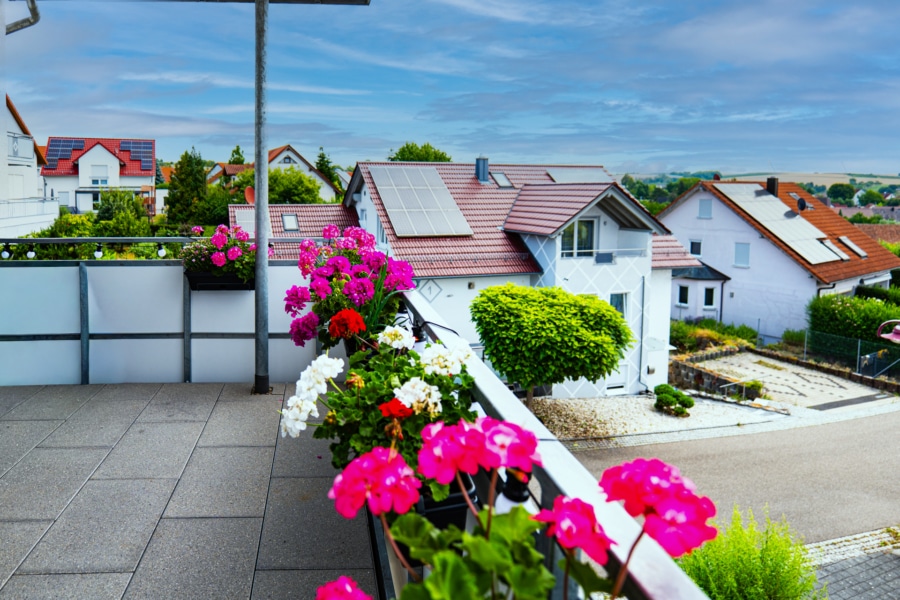 Der offene Wohn- und Essbereich empfängt Sie mit großzügigem Lichteinfall und direktem Zugang zum Balkon – ein idealer Ort für entspannte Stunden im Freien.