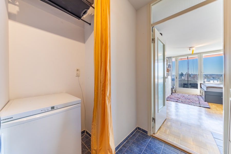 Die Wohnfläche von ca. 30 m² ist effizient geschnitten und umfasst einen Wohn-/Schlafraum mit moderner Einbauküche (aus 2020), ein gepflegtes Badezimmer mit Duschwanne und Waschmaschinenanschluss sowie eine praktische Abstellnische im Flur. Hochwertiger Tafelparkett im Wohnbereich sorgt für ein stilvolles Ambiente, während Küche, Bad und Flur gefliest sind.