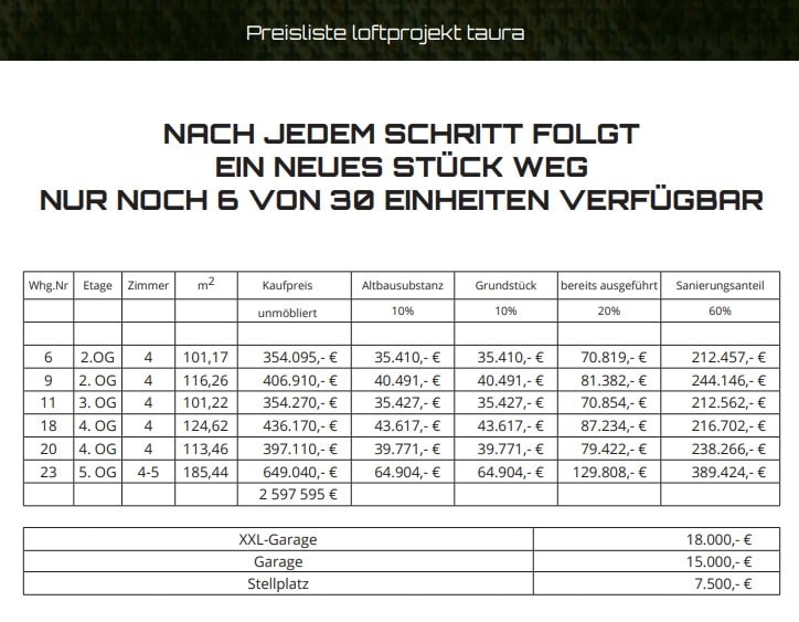 Laut aktueller Aufstellung entfallen bei den Einheiten bis zu 60 % des Kaufpreises auf Sanierungskosten, was die Attraktivität des Investments zusätzlich steigert.