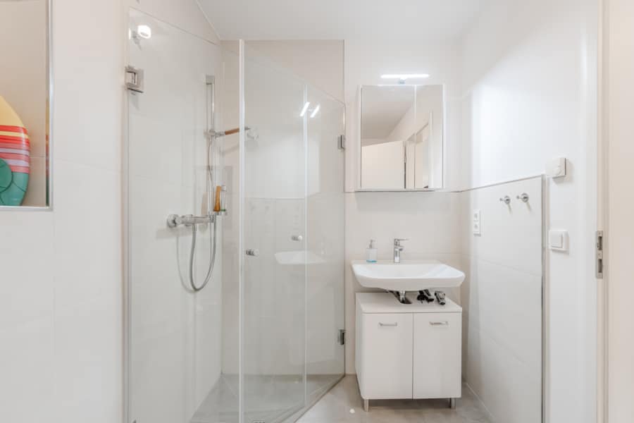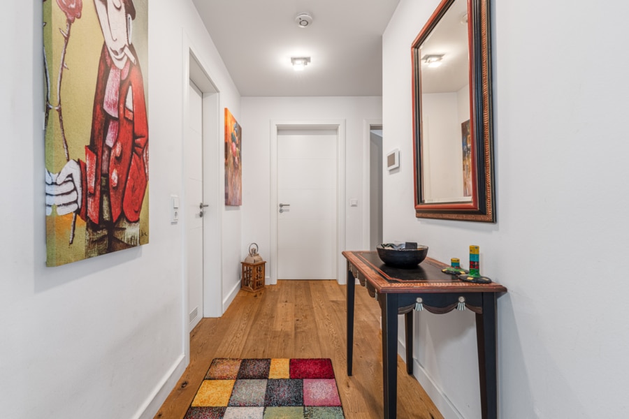 Der gesamte Wohnbereich ist mit edlem Parkettboden und einer Fußbodenheizung ausgestattet, die für behagliche Wärme und ein angenehmes Raumklima sorgt. Das moderne Badezimmer mit ebenerdiger Dusche und Badewanne überzeugt durch hochwertige Armaturen und geschmackvolle Materialien.
