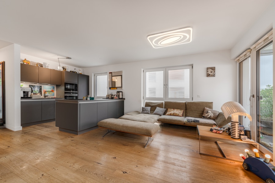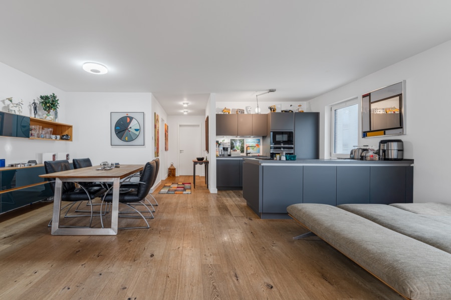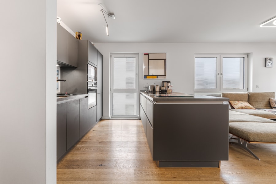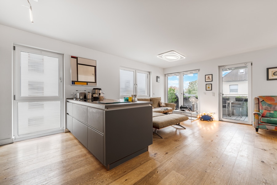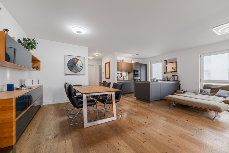 Bereits beim Betreten spürt man die Großzügigkeit und Klarheit des Raumkonzepts. Der offene Wohn- und Essbereich mit seinen bodentiefen Fenstern ist lichtdurchflutet und bildet das Herzstück der Wohnung. Die stilvolle Einbauküche mit zentraler Kochinsel fügt sich harmonisch in das Wohnambiente ein – ein Treffpunkt für Familie und Freunde, der Kochen und Kommunikation miteinander verbindet. Hier wird Wohnen zum Erlebnis.