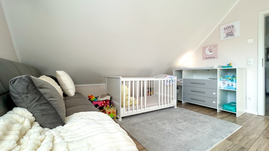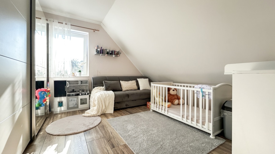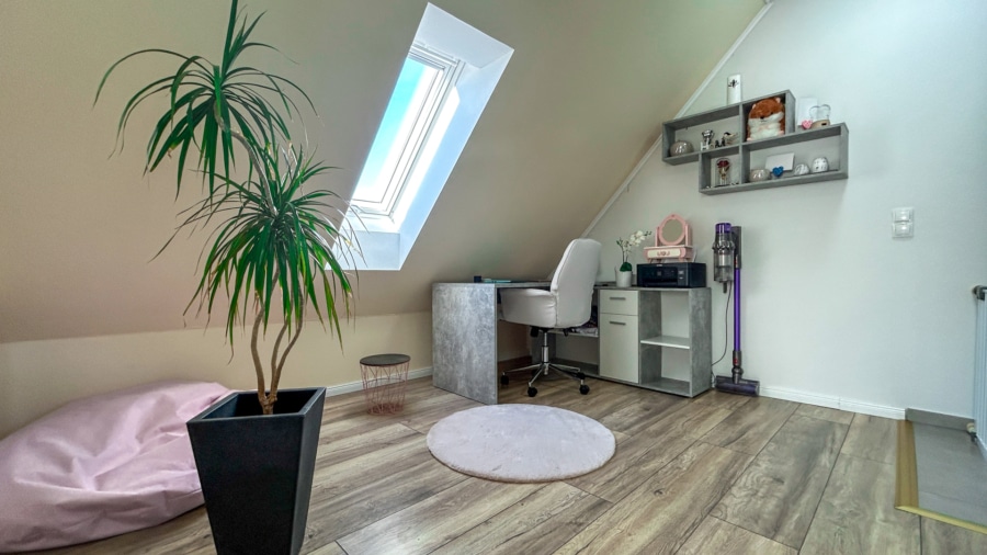 Das 2. Obergeschoss bietet zwei gut geschnittene Schlafzimmer, ein modernes Tageslichtbad mit ebenerdiger Dusche sowie eine Büroecke, die sich ideal für Homeoffice oder als zusätzlichen Arbeitsbereich eignet.