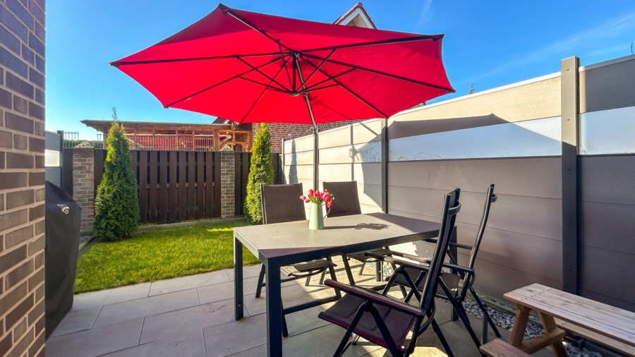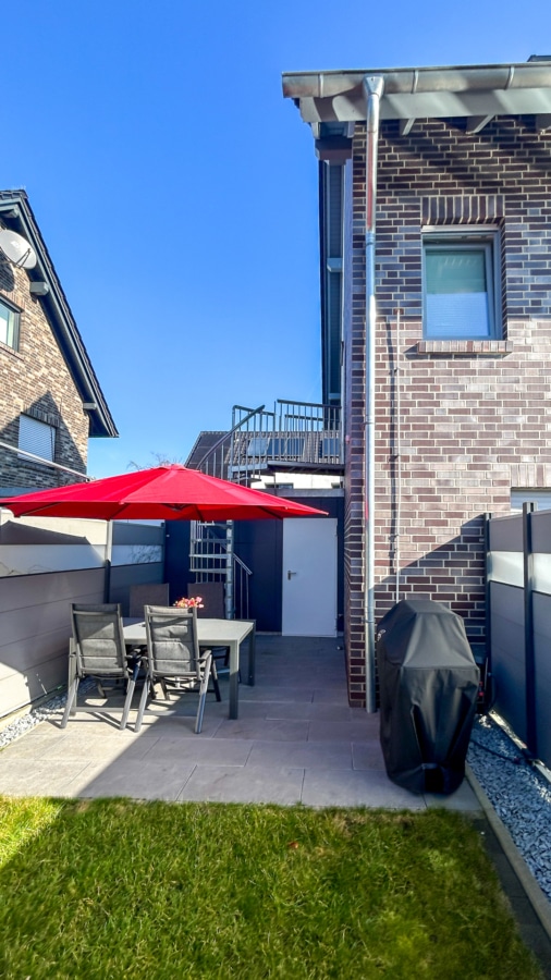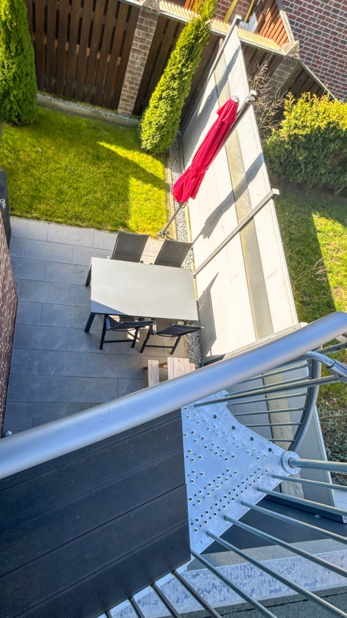 Über eine Außentreppe erreichen Sie den zur Wohnung gehörenden Gartenanteil von ca. 30 m², der zusätzlichen Platz zum Entspannen, Spielen oder für gemütliche Grillabende bietet. Alternativ ist der Garten auch bequem über die zur Wohnung gehörende Garage erreichbar.