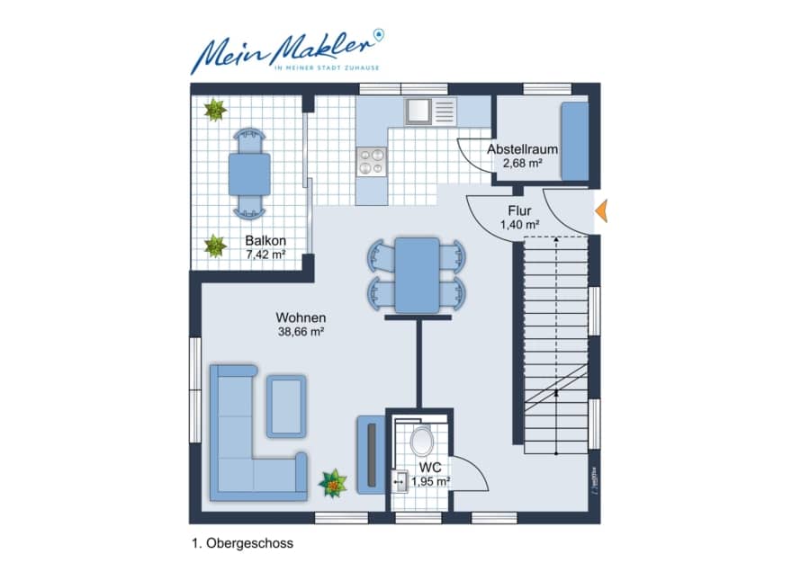 Im 1. Obergeschoss erwartet Sie ein großzügiger und lichtdurchfluteter Wohn- und Essbereich mit offener, moderner Küche, die bereits im Kaufpreis enthalten ist. Von hier aus gelangen Sie direkt auf die Loggia in Südwest-Ausrichtung, die viele Sonnenstunden bietet und zum Entspannen im Freien einlädt. Ergänzt wird diese Ebene durch einen praktischen Abstellraum sowie ein Gäste-WC.