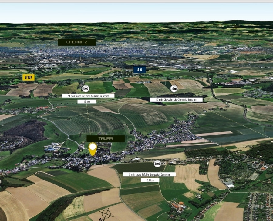Die Lage bietet insbesondere für Pendler und Berufstätige beste Voraussetzungen. Die Stadt Chemnitz ist in kurzer Zeit erreichbar und eröffnet Zugang zu Arbeitsplätzen, urbanem Leben, Kultur und vielfältigen Einkaufsmöglichkeiten. Gleichzeitig genießen Sie in Taura eine entspannte Wohnatmosphäre fernab vom Trubel der Großstadt.