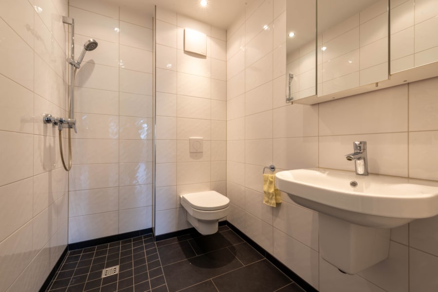 Das Hauptbad verfügt über eine bodengleiche Dusche, eine Badewanne und ein Fenster, während das zweite, innenliegende Duschbad – ebenfalls ebenerdig ausgeführt – direkt an das Gäste- oder Arbeitszimmer angrenzt. Diese Kombination eignet sich ideal für Besucher oder als separates Bad für den zweiten Wohnbereich.
