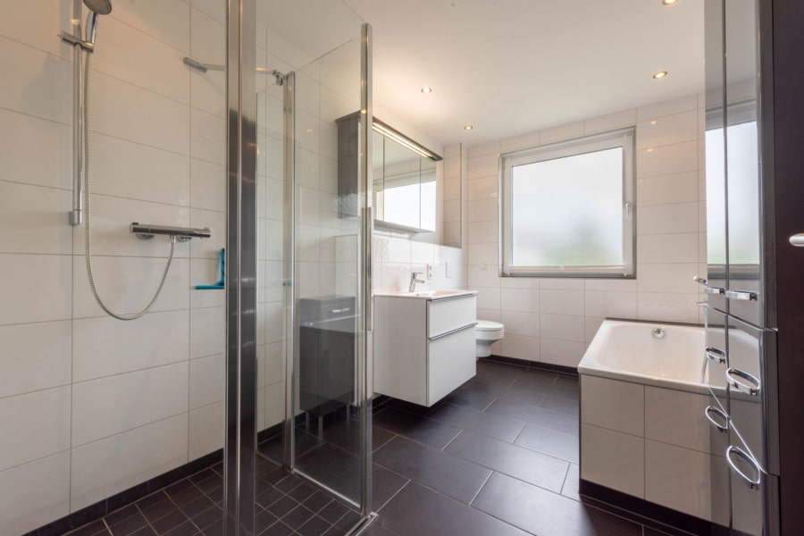 - Hauptbad mit ebenerdiger Dusche, Badewanne und Fenster