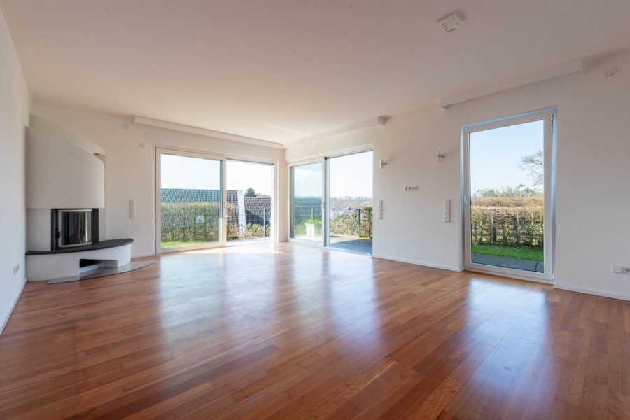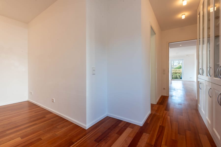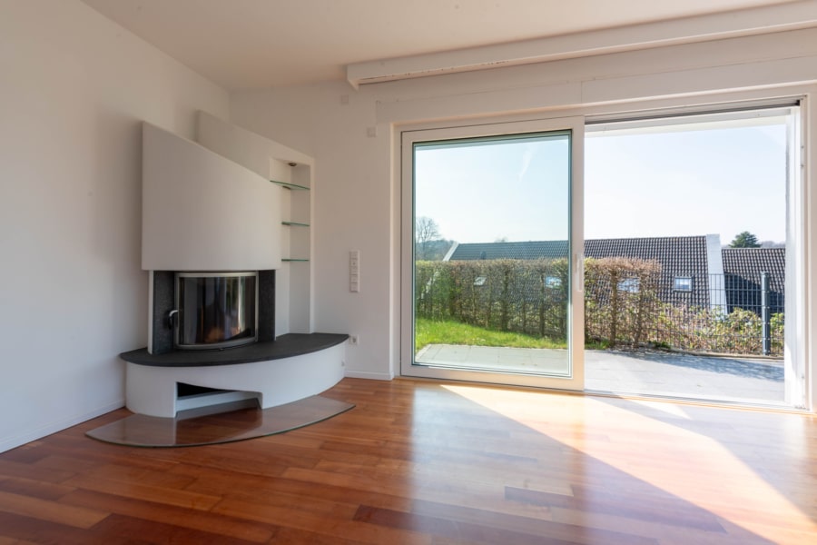 Auf ca. 111 m² großzügig geschnittener Wohnfläche verteilen sich drei Zimmer, die durch edlen Parkettboden aus amerikanischer Kirsche ein besonders warmes und elegantes Wohnambiente vermitteln. Das Herzstück der Wohnung bildet der lichtdurchflutete Wohn- und Essbereich, der mit einem Kamin, zwei großzügigen Schiebetürelementen sowie einem bodentiefen Fenster ausgestattet ist. Die Fenster sorgen nicht nur für eine angenehme Lichtdurchflutung, sondern ermöglichen auch einen direkten Zugang zur überdachten Terrasse mit elektrischer Markise und in den angrenzenden Privatgarten – ein idealer Rückzugsort mit hoher Lebensqualität. Von hier aus eröffnet sich zudem ein Blick in Richtung Baldeneysee.