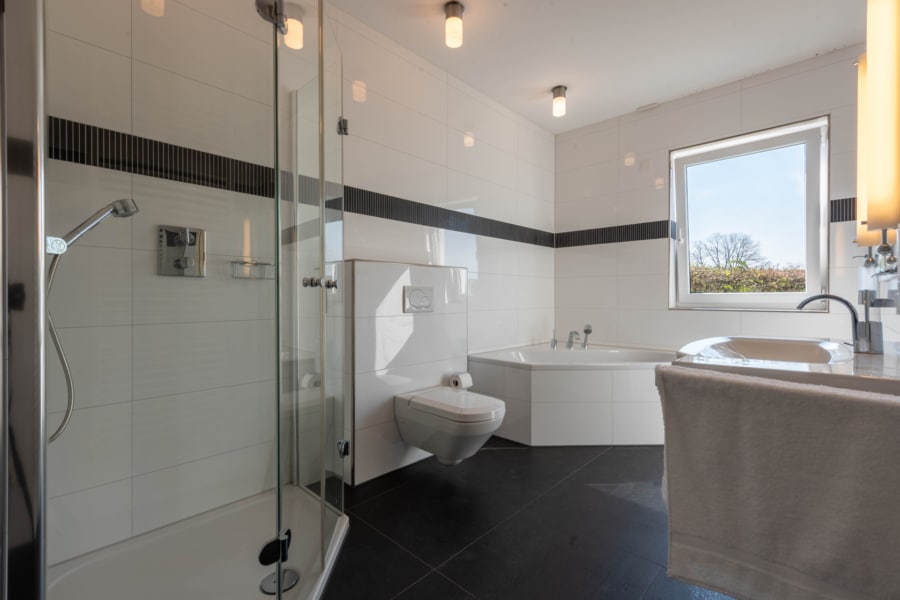 - Hauptbadezimmer mit Dusche, Wanne und Fenster sowie Gäste-WC mit Fenster