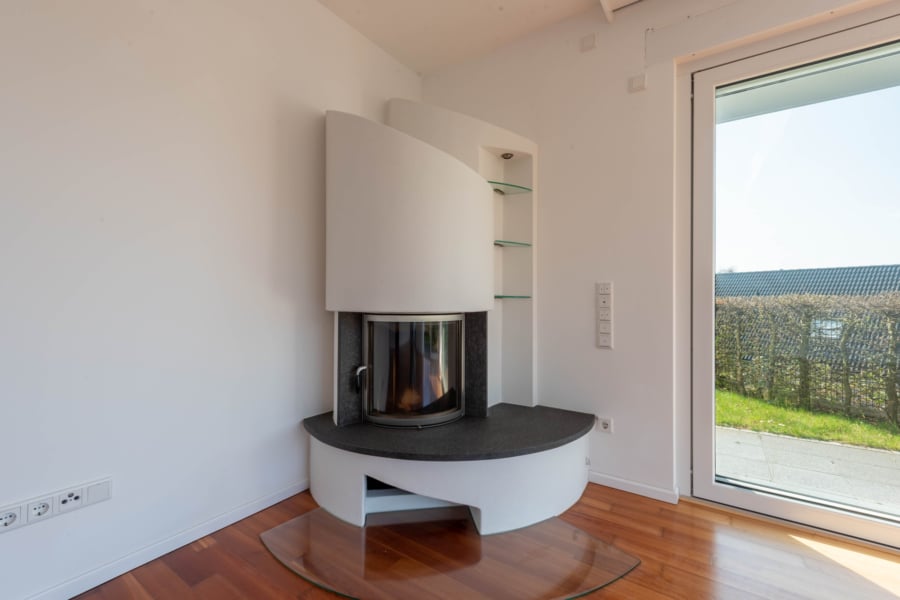Die hochwertige Einbauküche, ein stilvoller Kamin sowie maßgefertigte Einbauten im Arbeitszimmer unterstreichen den gehobenen Anspruch. Das moderne Hauptbadezimmer mit Dusche, Badewanne und Fenster überzeugt zudem durch einen in die Wand eingelassenen Spiegelschrank sowie einen praktischen Waschmaschinenanschluss. Ein separates Gäste-WC mit Fenster bietet zusätzlichen Komfort.