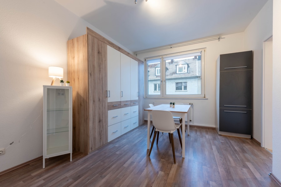 Die ca. 46 m² große Wohnung wurde 2026 malerisch überarbeitet und erwartet Sie voll möbliert und bereit für den möblierten Erstbezug. Vom gemütlichen Eingangsbereich mit Garderobennische gelangen Sie in sämtliche Räume. Der lichtdurchflutete Wohn- und Schlafbereich bietet mit einem französischen Balkon nicht nur Luft und Licht, sondern auch einen kurzen Moment an der frischen Luft. Ein neuwertiges 1,60 m Bett, eine Couch, ein 55-Zoll-Fernseher sowie diverse Stauraummöglichkeiten und ein Internetanschluss (in der Miete enthalten) lassen keine Wünsche offen.