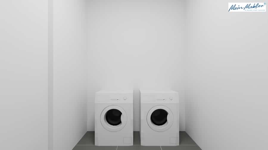 Das Badezimmer ist hochwertig ausgestattet und seniorengerecht gestaltet. Auch an praktische Dinge wurde gedacht: Ein separater Hauswirtschaftsraum mit Anschluss für Waschmaschine und Trockner macht Wege in den Keller überflüssig.