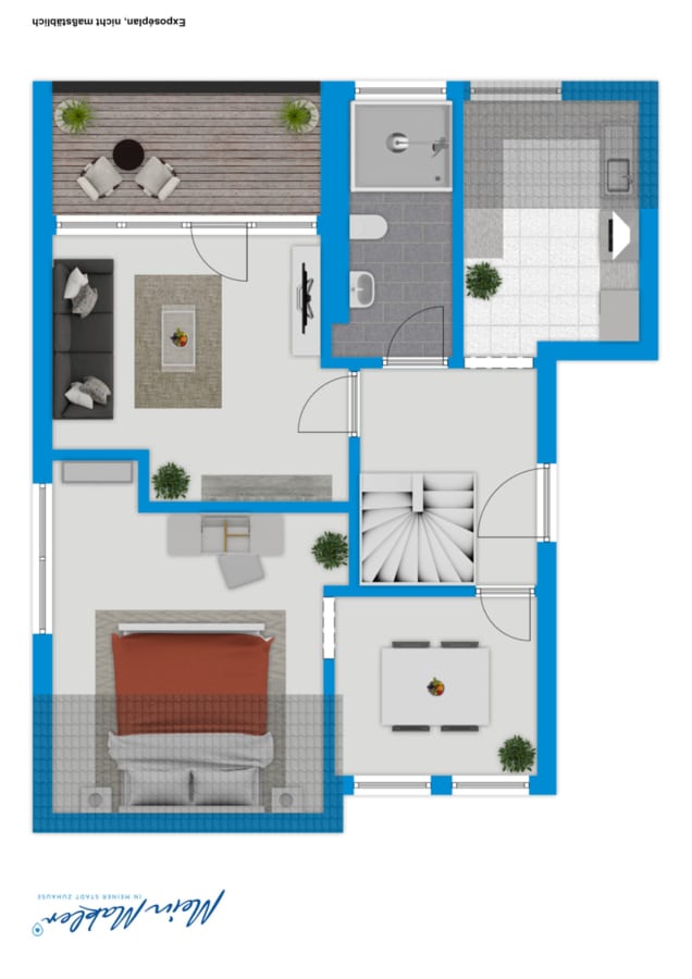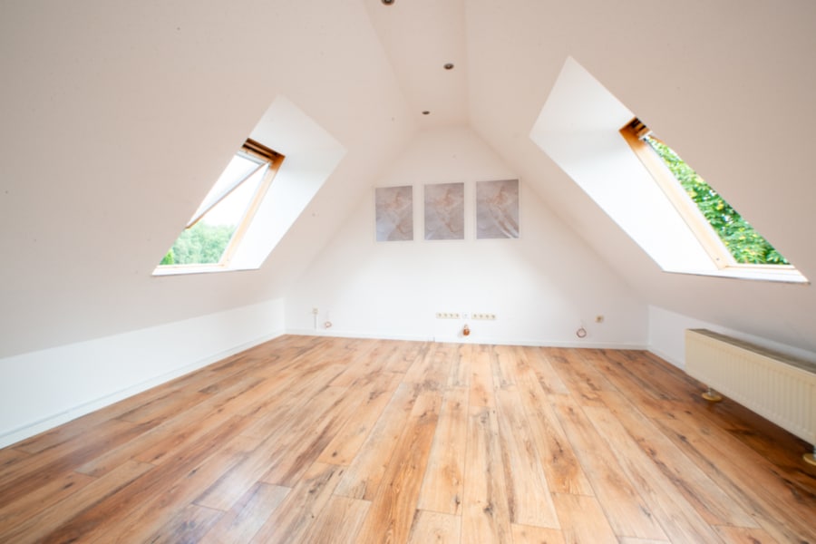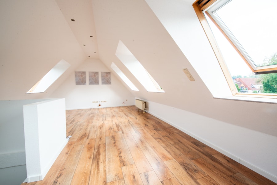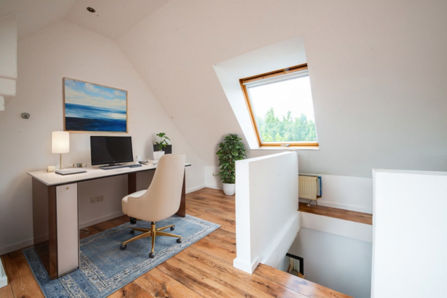 Eine elegante Wendeltreppe führt Sie in das obere Stockwerk der Maisonette. Hier erwartet Sie ein großzügiger Bereich, der vielseitig nutzbar ist und sich ideal als Arbeits- und weiteres Schlafzimmer eignet.