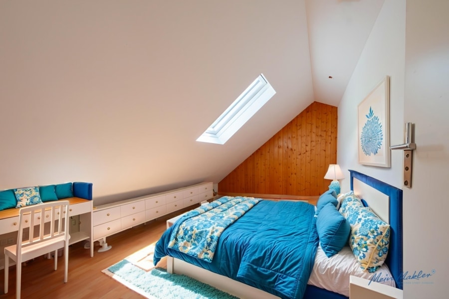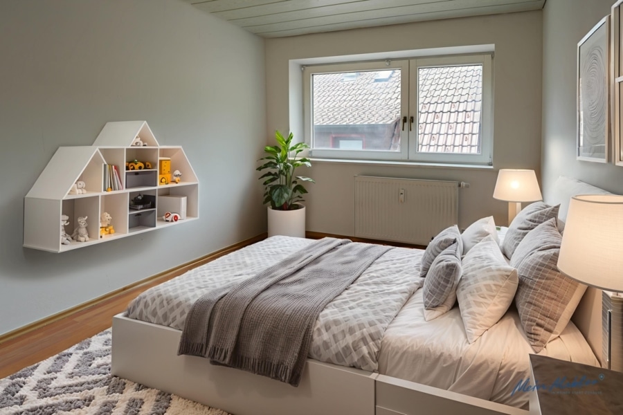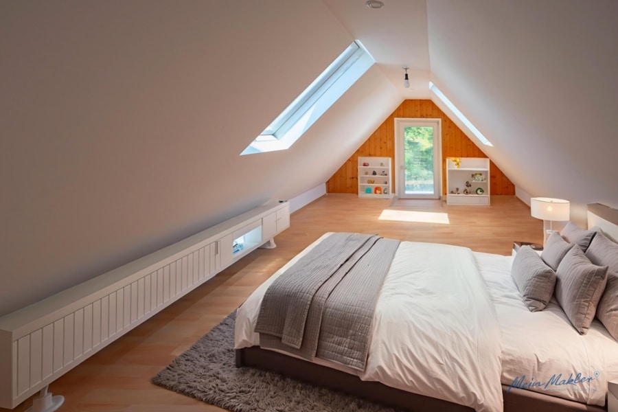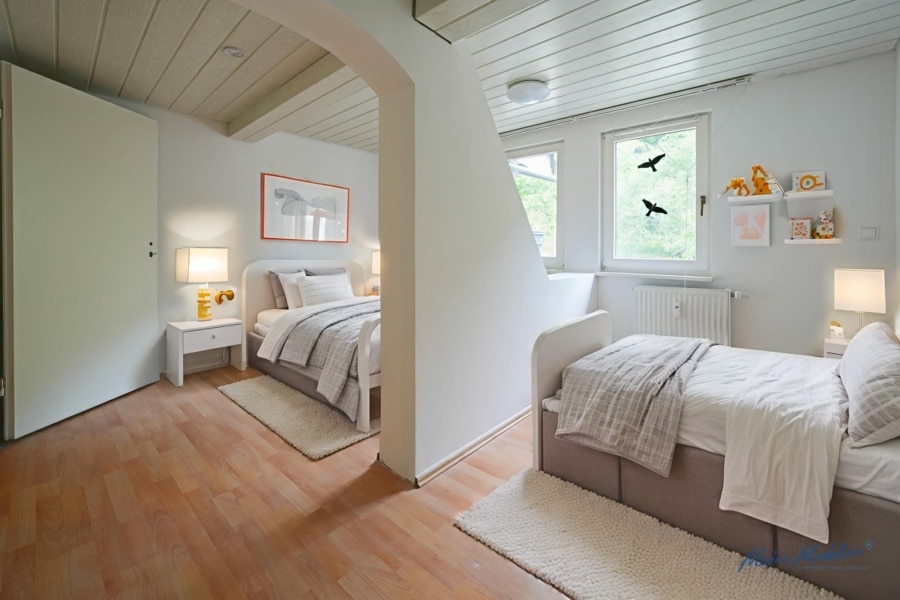 Die Wohnung verteilt sich auf das 1. Obergeschoss und das ausgebaute Dachgeschoss eines sehr gepflegten Mehrfamilienhauses. Im unteren Bereich erwarten Sie ein lichtdurchflutetes Wohnzimmer, drei Schlafzimmer, eine separate Küche sowie ein modernes Tageslichtbad mit Wanne und Dusche. Im Dachgeschoss eröffnen sich zwei weitere Schlafzimmer, ein großer Wohnbereich mit offener Küchenmöglichkeit sowie ein weiteres Bad mit Dusche.